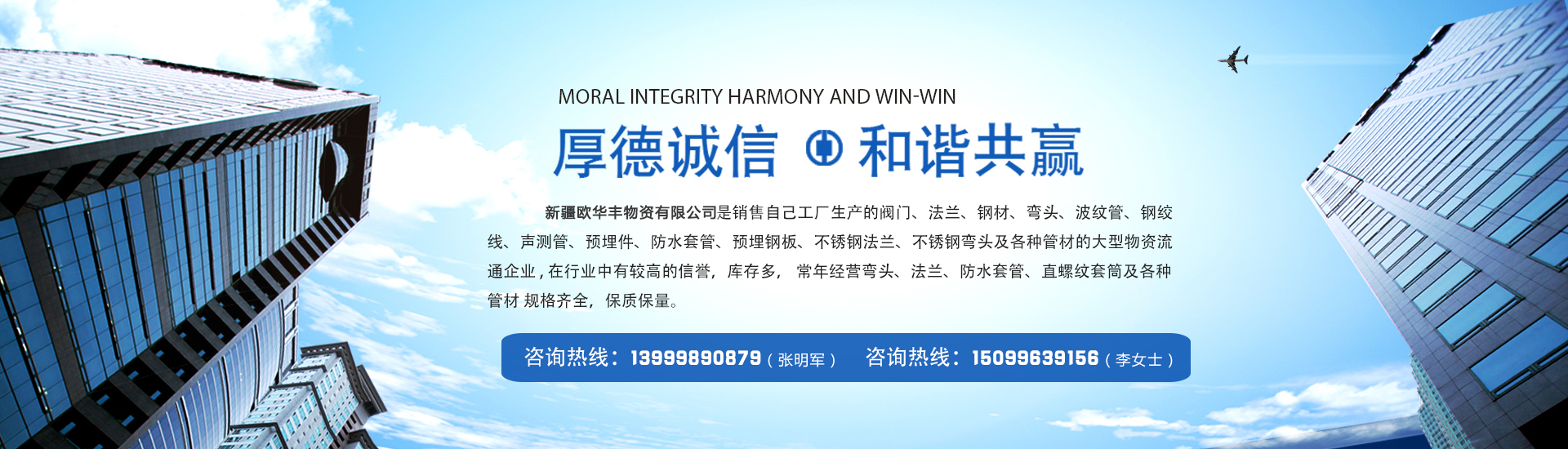 新疆歐華豐物資有限公司是銷(xiāo)售自己工廠生產(chǎn)的彎頭 法蘭 防水套管 及各種管材的大型物資流通企業(yè) , 在行業(yè)中有較高的信譽(yù),庫(kù)存多,常年經(jīng)營(yíng)閥門(mén)、法蘭、鋼材、彎頭、波紋管、鋼絞線(xiàn)、聲測(cè)管、預(yù)埋件、防水套管、預(yù)埋鋼板、不銹鋼法蘭、不銹鋼彎頭及各種管材 規(guī)格齊全,保質(zhì)保量。 公司一貫以: 服務(wù)上乘、質(zhì)量?jī)?yōu)質(zhì)、價(jià)格合理、客戶(hù)至上、服務(wù)周到、讓利客戶(hù)、薄利多銷(xiāo)為原則,誠(chéng)實(shí)守...